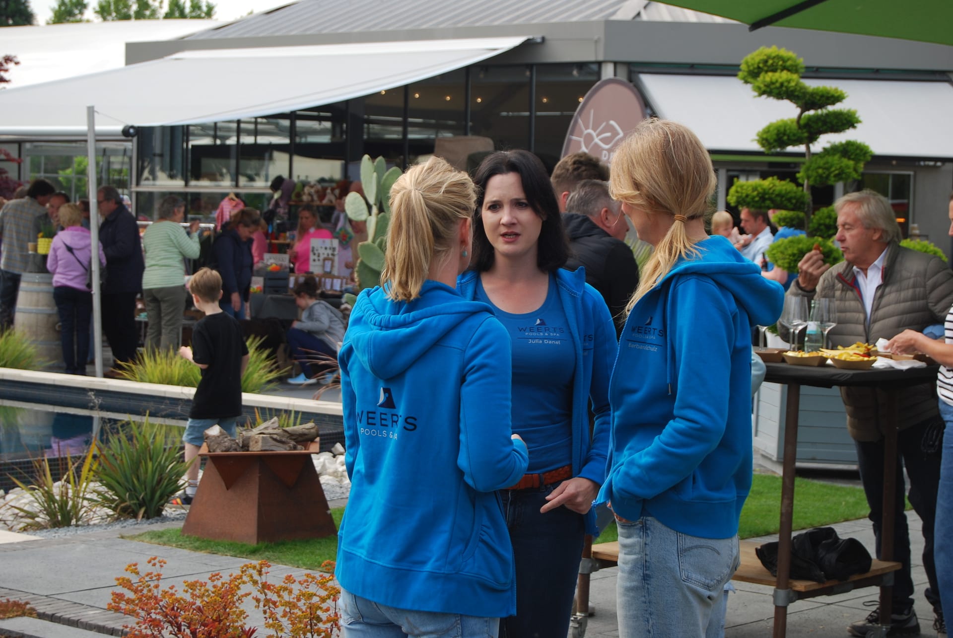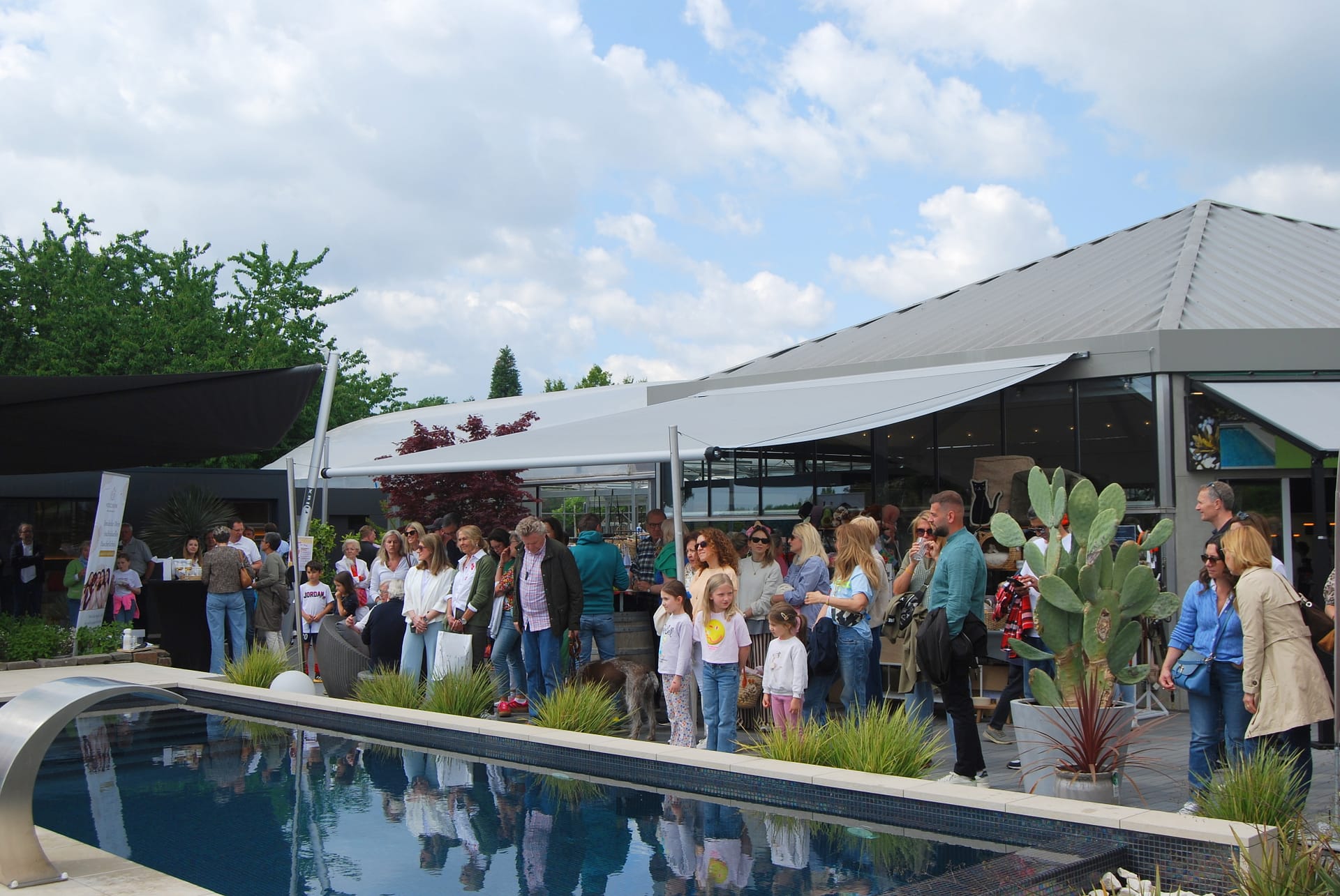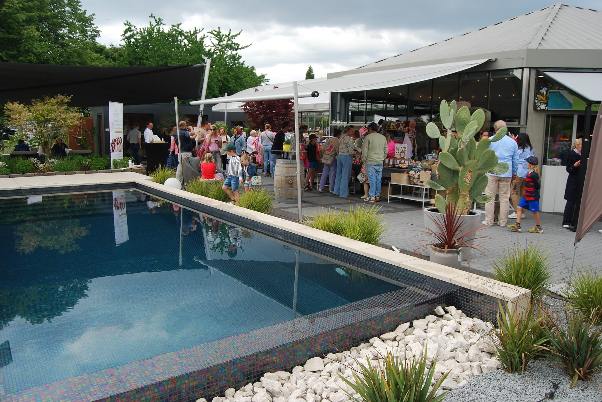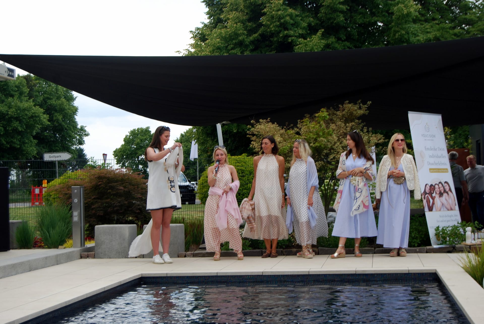 Mit einer farbenfrohen Fashionshow rund um den schönen Ausstellungs-Pool, kulinarischen Köstlichkeiten, inspirierender Kunst und bunten Angeboten von Händlern aus Meerbusch und Umgebung.