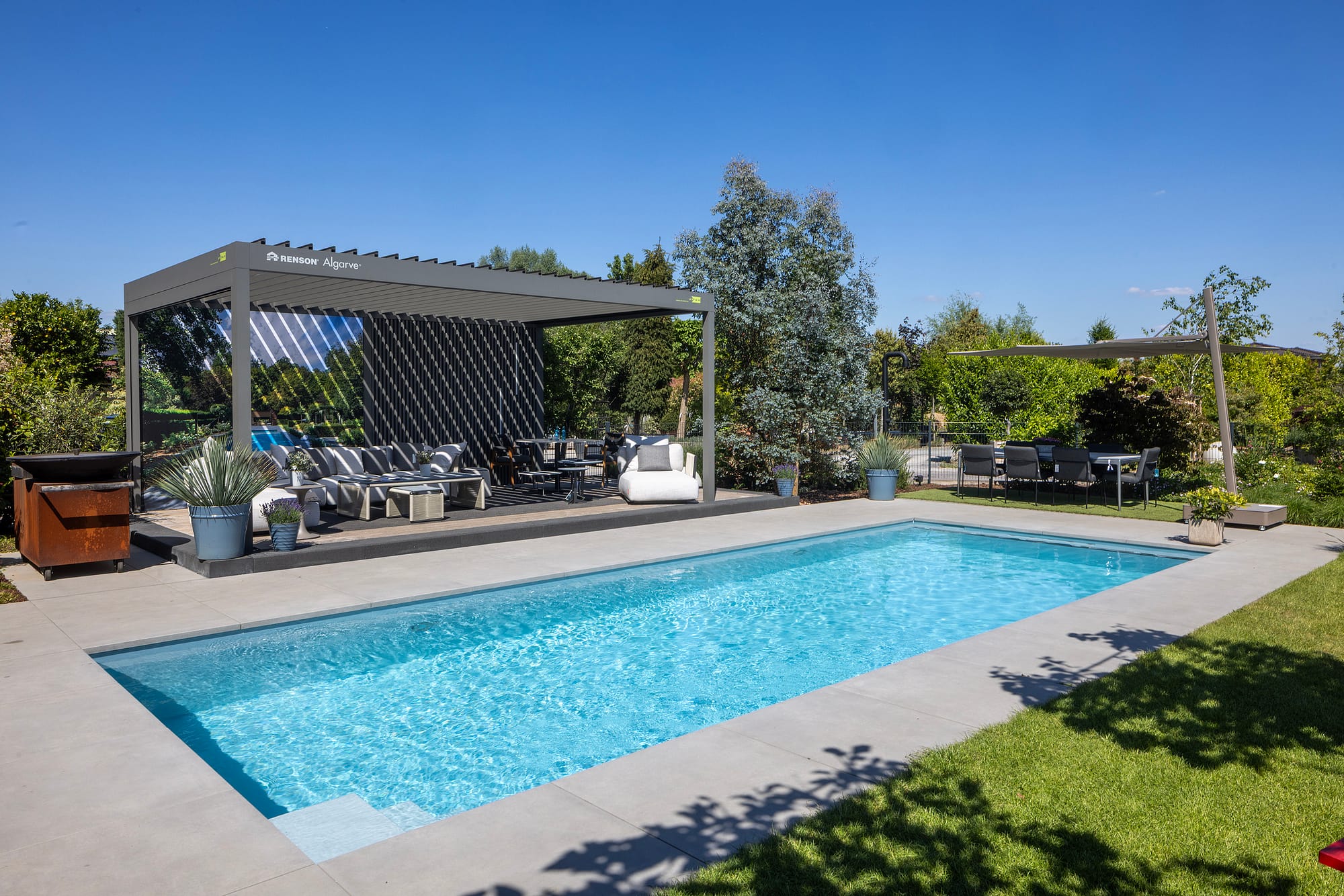 Hochwertige Pools und Whirpools, Saunen, einzelne Pflanzen oder ganze Gartenlandschaften, smarte Sonnenschutzlösungen und edle Terrassen, sowie Outdoormöbel und Accessoires.